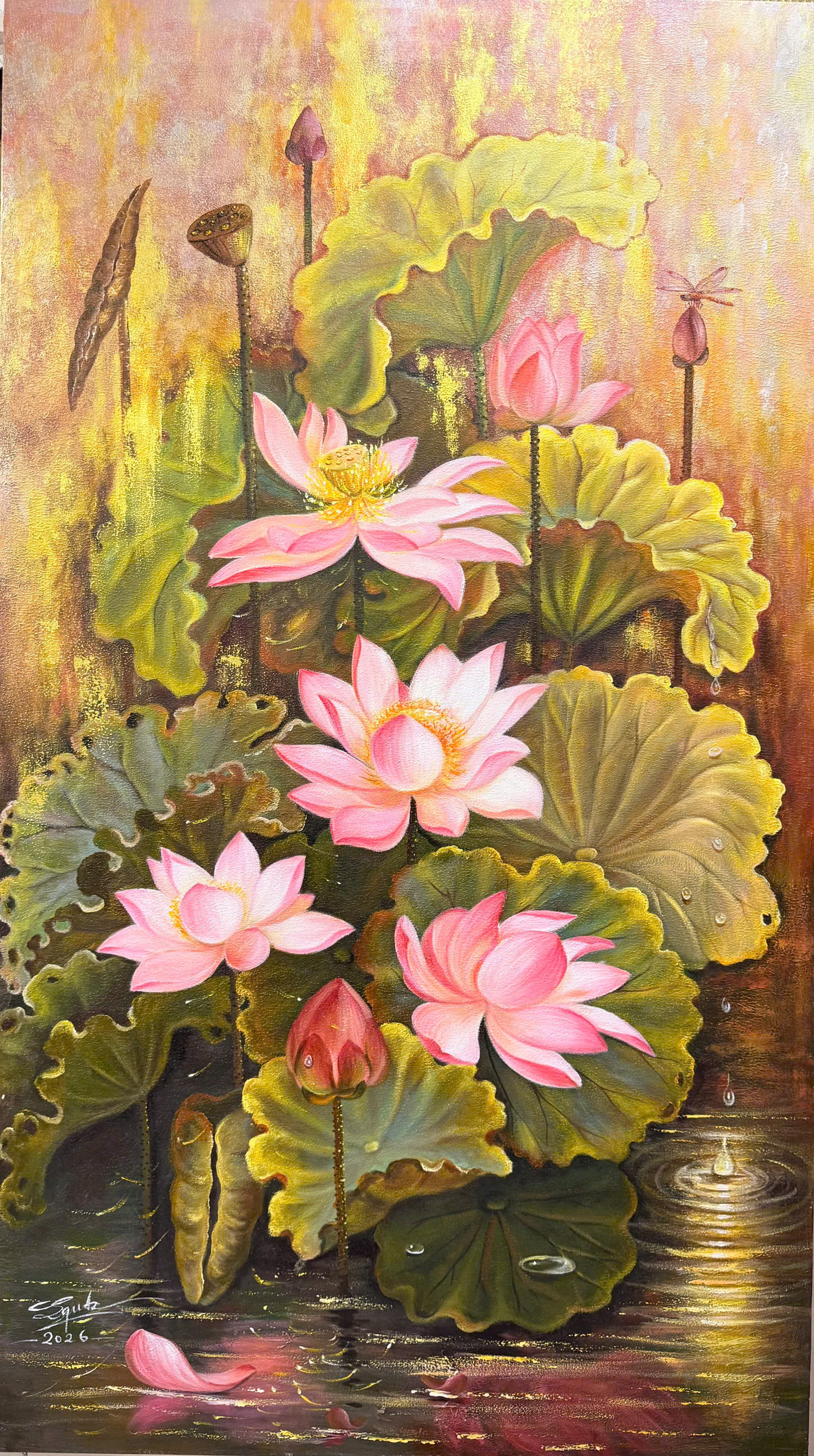 Nghệ thuật đầy mê hoặc với gam màu vàng kim chủ đạo, gợi liên tưởng đến ánh nắng lấp lánh rót xuống mặt hồ vào một buổi chiều rực rỡ. Những đóa sen hồng vươn mình mạnh mẽ, cánh hoa mềm mại với các sắc độ chuyển từ hồng nhạt sang đậm dần, tạo nên sự sống động và chiều sâu đầy tinh tế.